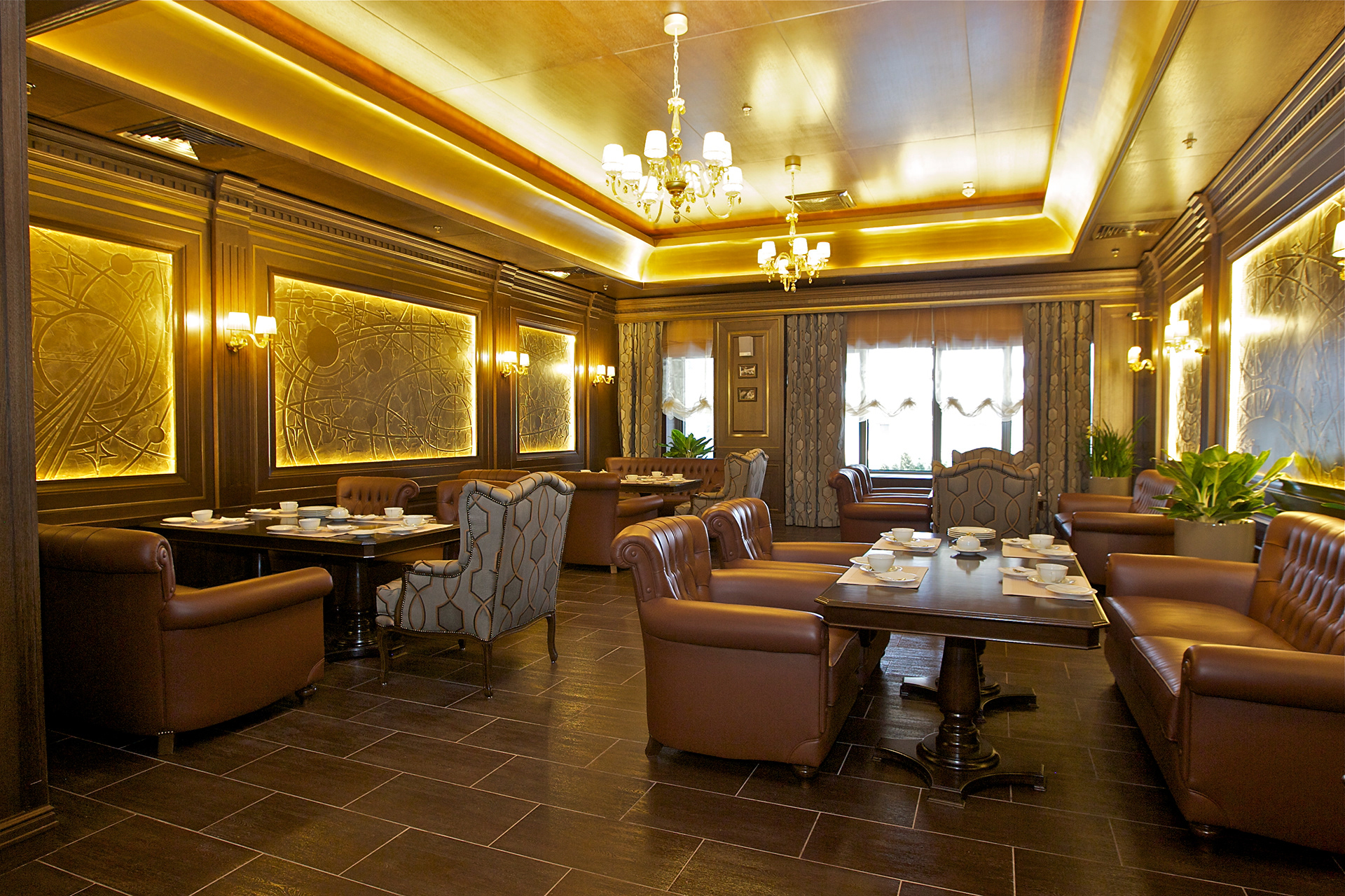 Create a warm and "solar" atmosphere inside the restaurant with lighting.
